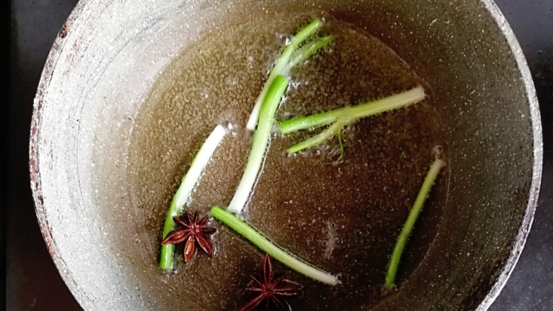 3. 醒面的时候来做油酥,锅内倒入油和葱段、八角炸香