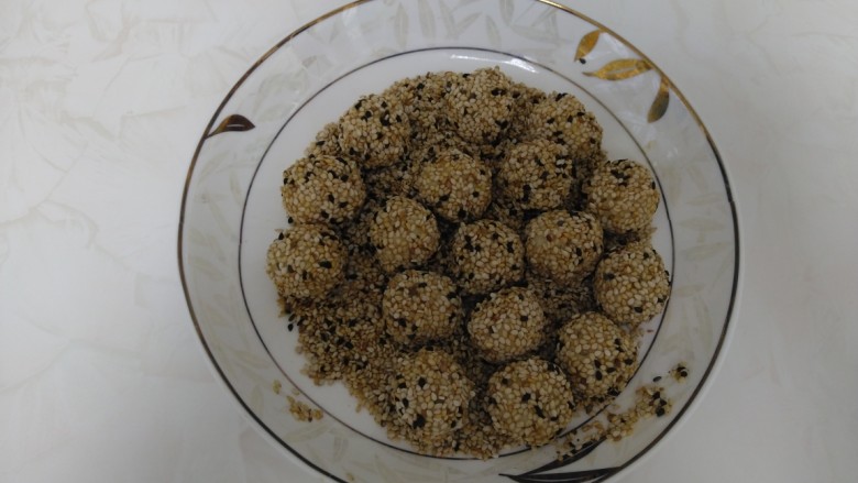 8. 在芝麻上滚一圈,使其均匀粘上芝麻。