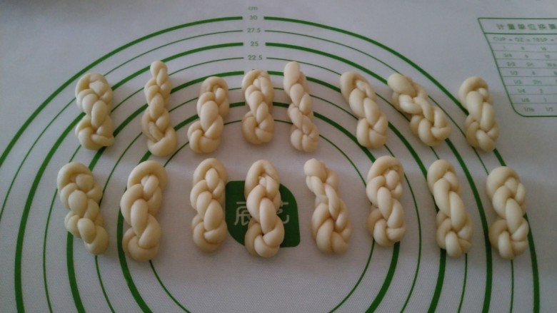 16. 锅中放入适量油,丢入一个小面团,三、五秒钟马上浮起来,把所有麻花胚子放入锅中。
