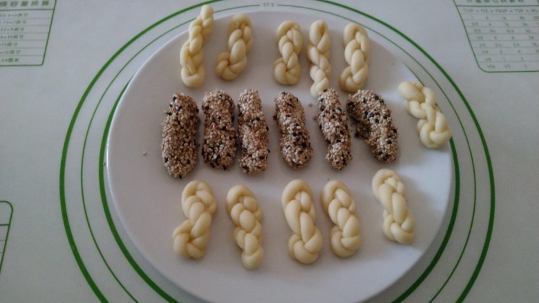 13. 如喜欢吃粘芝麻的,取一个麻花胚子放在蛋液中。