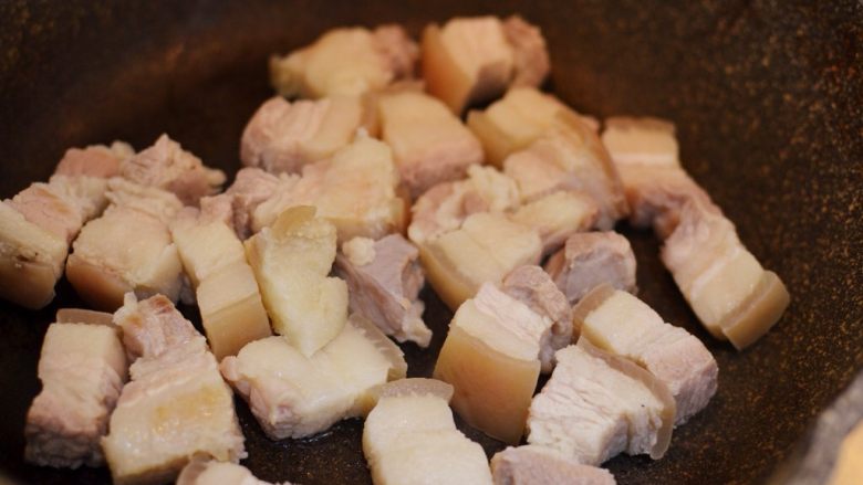 6. 锅烧热,不放油,放入五花肉,小火煸炒。