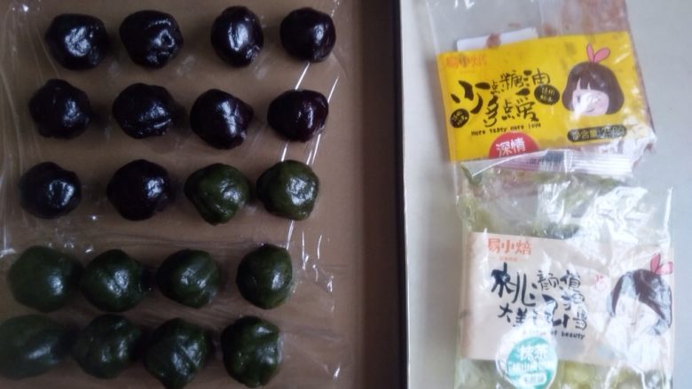 1. 将抹茶桃山皮和红豆馅各分成25克一份,共10份,搓圆,并盖上保鲜膜防止风干