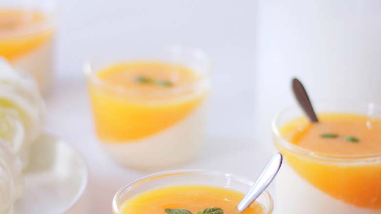 9. 取出凝固的牛奶布丁,倒满芒果泥。