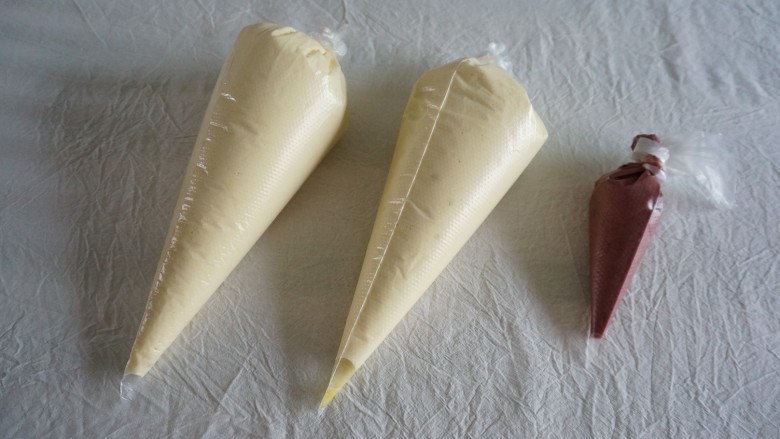 13. 挤入原味的蛋糕糊至模一半位置,180度烤5分钟