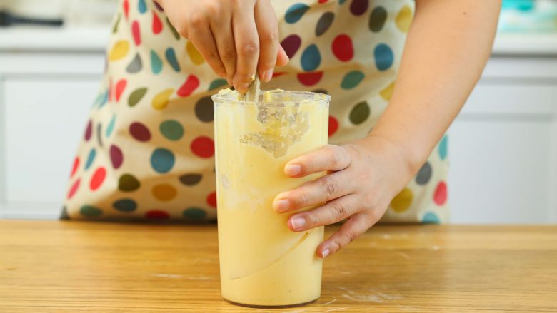 9. 将油菜碎加到剩下的糊中,用料理棒搅打成糊,加食用油,搅拌均匀~