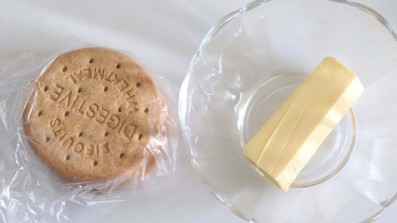 2. 饼干放入保鲜膜中,用擀面杖压成细的粉末。