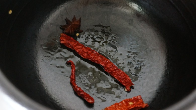 5. 锅倒入油加入一个辣椒和一个八角,爆香
