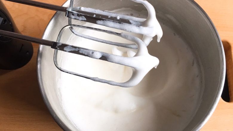 6. 再搅打50圈,蛋白变硬,光滑细腻,出现直立的小尖峰。
