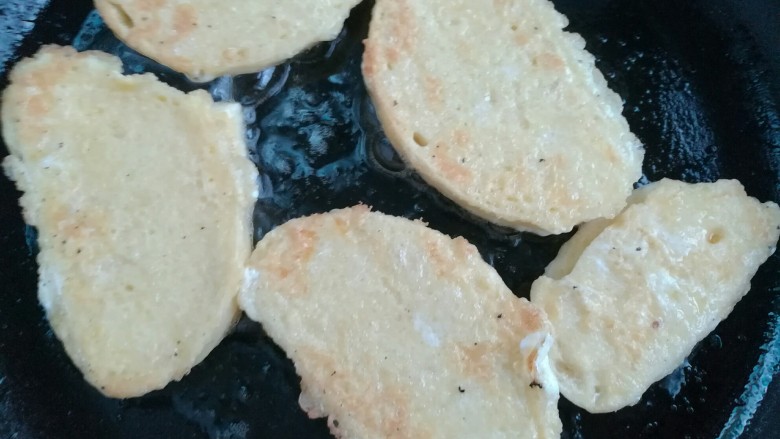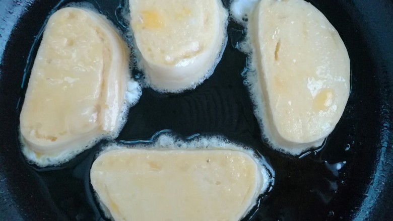 3. 平底锅加适量的花生油烧热,倒入裹好蛋液的馒头片