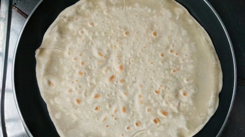 9. 然后翻面用锅铲轻轻拍一下。这样做出的饼皮面金黄、圆如满月,外面带有几颗气泡形成的褐色,里面既有嚼劲又不失松软。烙好的薄饼盖冷布或用盘扣一下,这样能使饼软而劲道,不干硬。