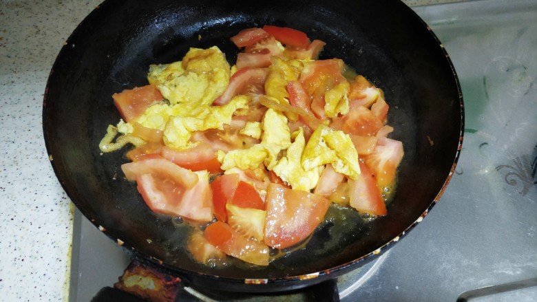 番茄鸡蛋面(方便面版),煎至番茄微微变软,加入适量水