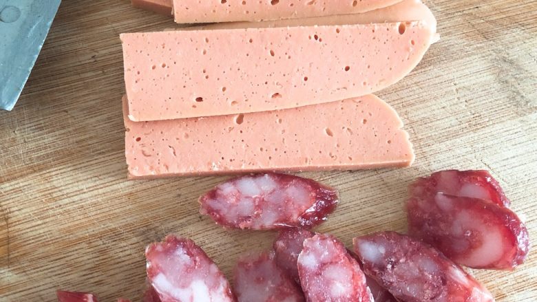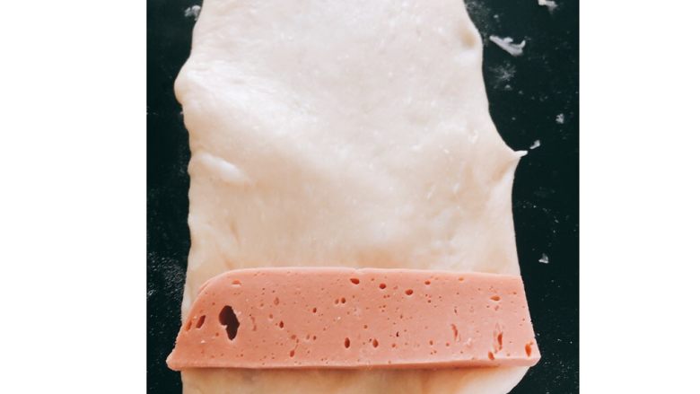 12. 面饼一角裹着火腿卷一圈,再放上腊肠,以此类推重复至整个面饼卷好。
