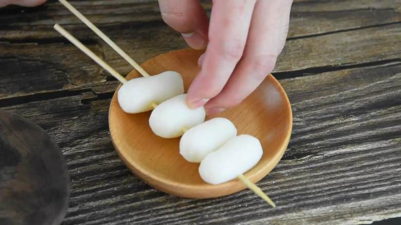 4. 热锅冷油,放入串好的年糕,一面煎至金黄。