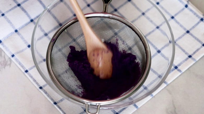 6. 过筛混合好的紫薯泥 tips:这样做出来的紫薯溶豆比较细腻,千万一定要过筛