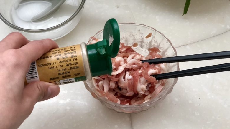 2. 因为肉丝要腌制十分钟,所以我们先来准备肉丝。一勺生粉加三勺水调成水淀粉