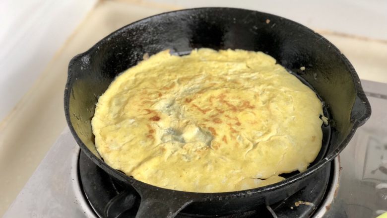 18. 热锅后小火,刷一层食用油,加入适量蛋液,转动锅子让蛋液铺满锅底