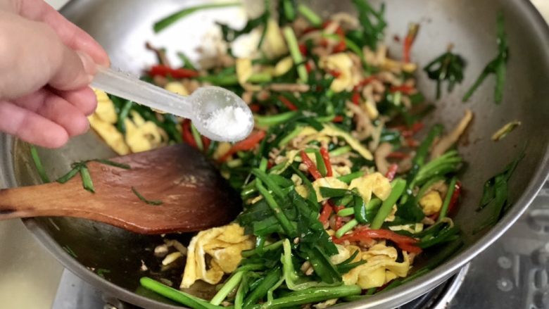 29. 尝下咸淡,根据个人口味添加适量食盐调味,翻炒均匀,即可关火装盘享用啦😛