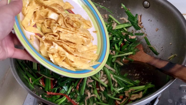 21. 蛋皮不烫手后,切成蛋皮丝,我切的不是很细