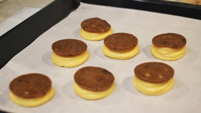 11. 烤盘上放上烘培油纸. 取出裱花袋, 挤出你需要的尺寸.