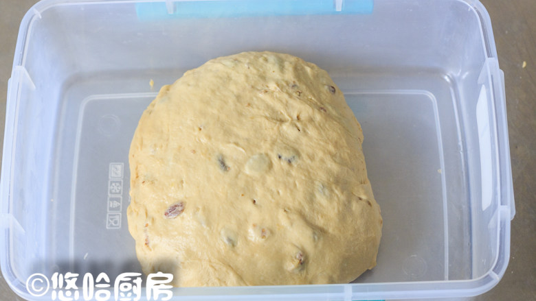 4. 面团中放入葡萄干、核桃仁,用手反复折叠面团,将果干包入面团即可,面团收光滑放入保鲜盒中,室温下发酵