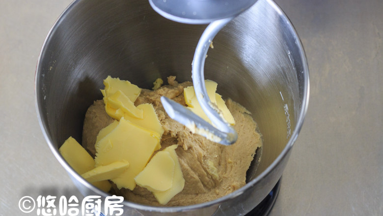 2. 除黄油、葡萄干、核桃仁外的所有材料,全部放入搅拌缸中,慢速3分钟、中速3分钟后放入室温下软滑的黄油。
