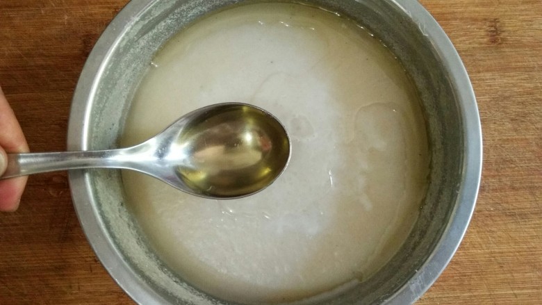 23. 搅拌均匀至粉糊顺滑无颗粒状,将粉糊舀起,下落时纹路不会瞬间消失为宜。