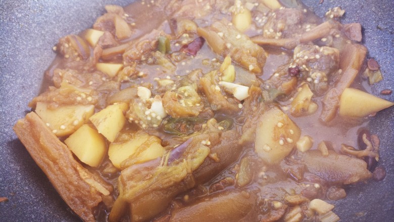 - 这道菜要把土豆和茄子都炖烂才好吃。