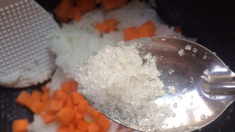 2. 把胡萝卜放在米饭上,然后放盐。