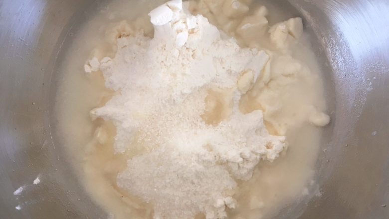 3. 容器内加入高筋面粉,细砂糖跟水,用筷子活成棉絮状