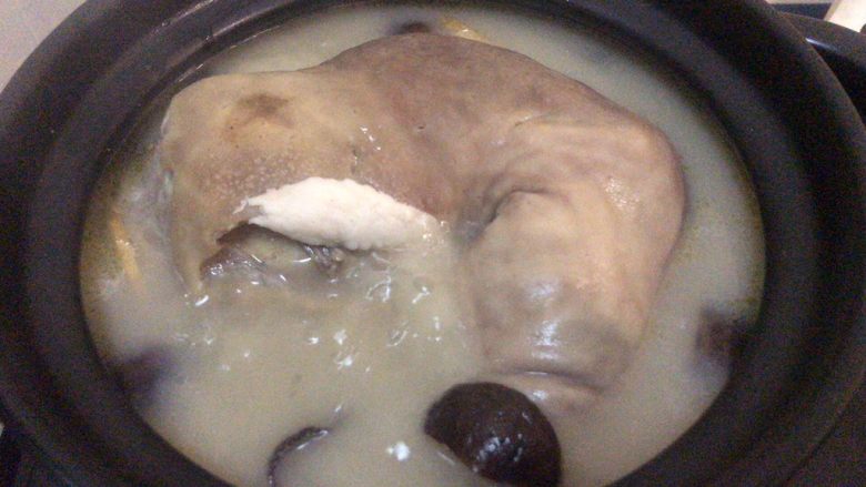 16. 将木耳和蘑菇连同泡发的水一起倒入锅中接着煮1小时,煮至猪肚软烂