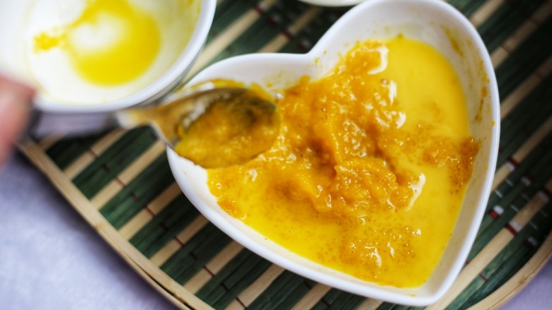美食丨营养健康 颜值爆棚的分层双色布丁~,一半放入南瓜泥中。分别搅拌均匀。