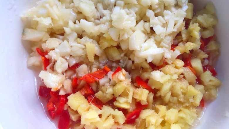 9. 把小米辣、生姜、蒜头全部放入柠檬汁里