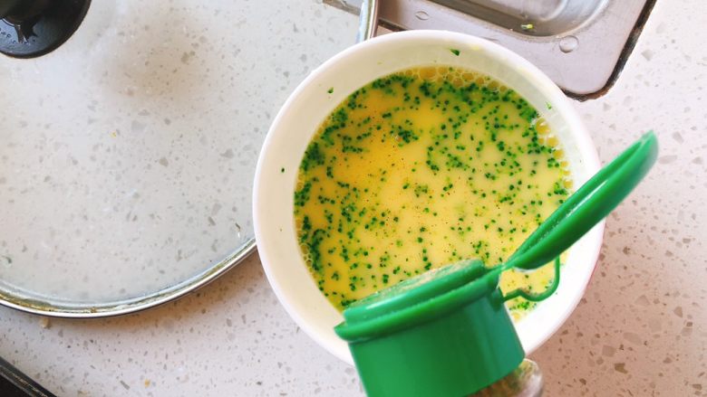 6. 将虾皮放入蒸蛋的碗中。