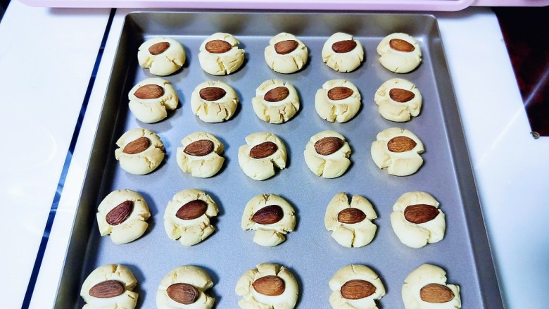 14. 用大拇指轻轻按压,无需太用力。避免中间太薄,看出来的饼干容易断裂,放上杏仁再轻轻按压。(一定要用大拇指,按力要均匀,这样才漂亮)