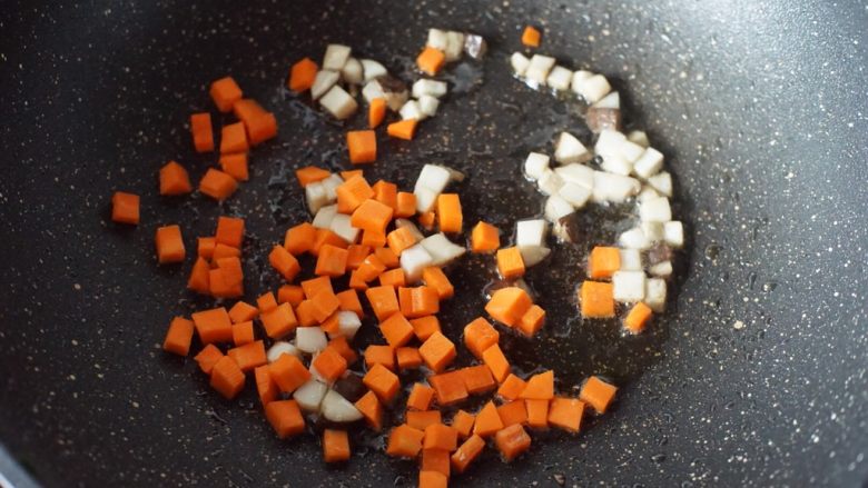 6. 利用锅里的余油放入杏鲍菇粒煎香