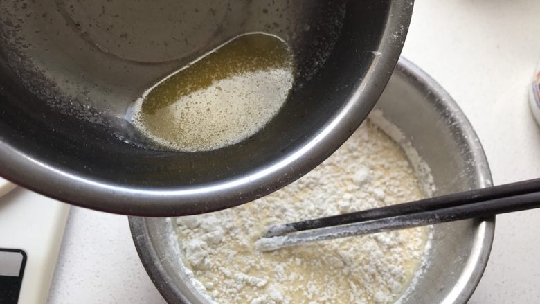 3. 把面粉过筛到鸡蛋牛奶打好的液体中,搅拌至顺滑无颗粒状态。