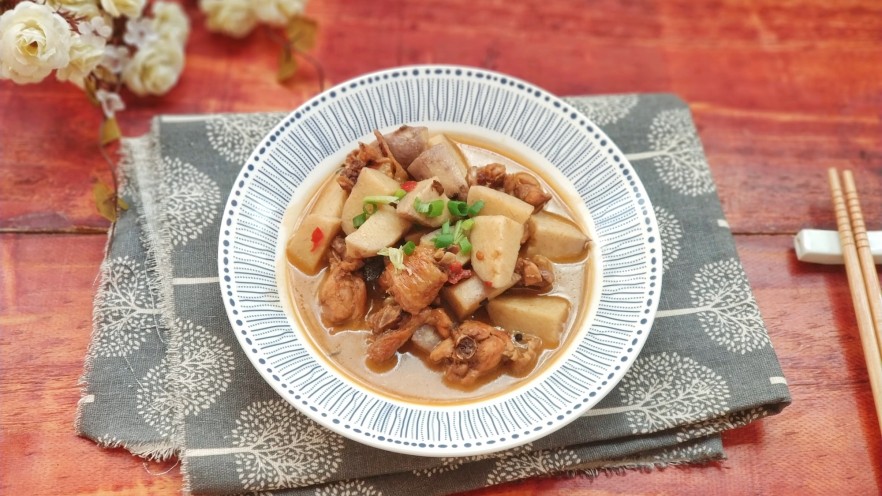 16. 将煮好的芋艿烧鸡,装在盘子上