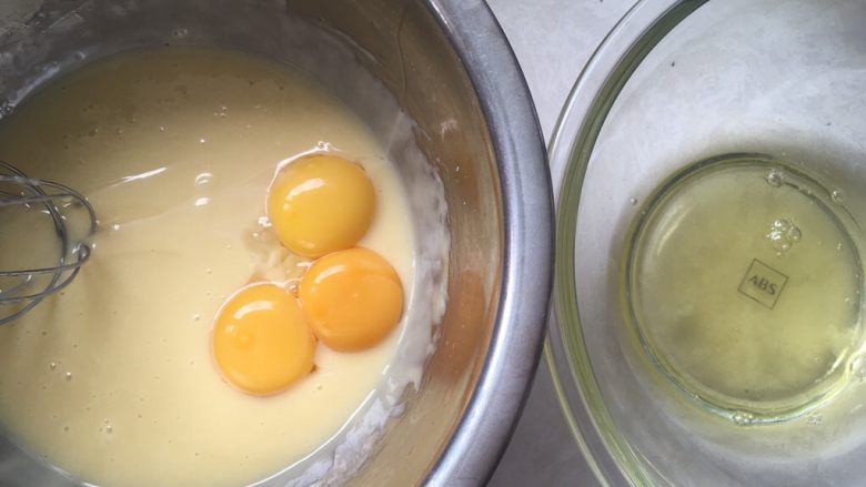 9. 分离鸡蛋,蛋白打至干净的容器,蛋黄加入到面糊中