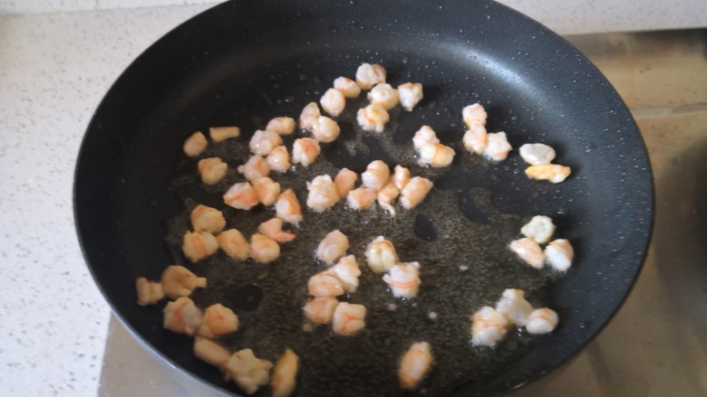 5. 锅里倒油,油热后倒入虾仁翻炒。