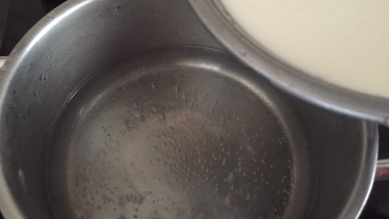 2. 剩下的水倒入奶锅中煮沸后倒入搅拌好的淀粉水,边煮边搅拌,煮到冒泡泡就可以关火了;