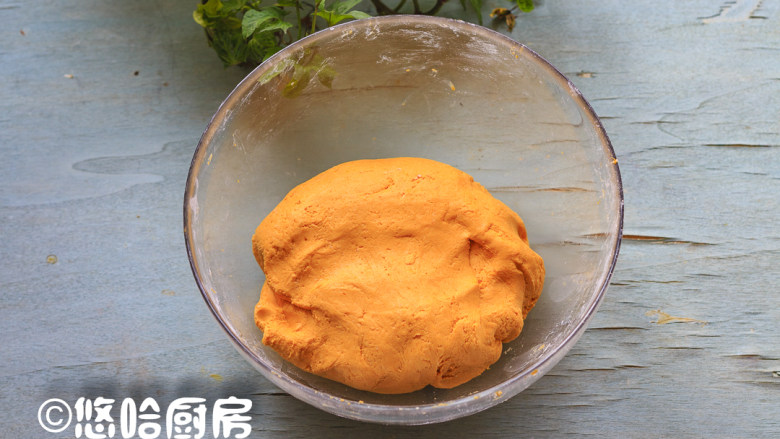 5. 再下手揉成稍软一点的面团。南瓜泥的用量要根据水分大小来定哈,水多了加面,面多了加水。