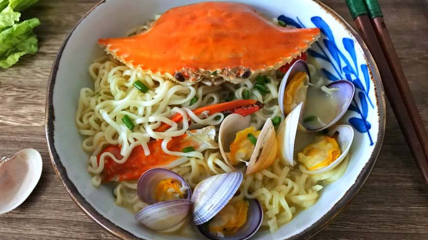 煮面条时加了梭子蟹和文蛤,不仅鲜,营养也好,这两样海鲜都含有丰富的蛋白质,维生素和钙、磷等矿物质,而且低脂肪,对于长身体的孩子来说非常不错,不仅暖胃还能补充能量。