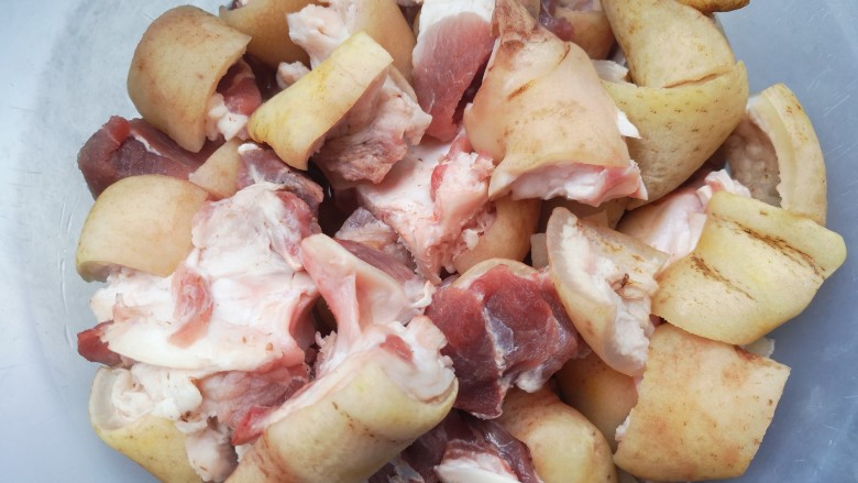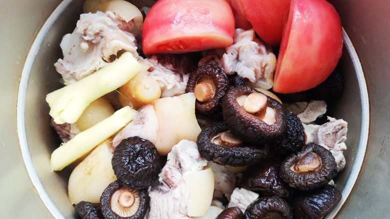 8. 将番茄、香菇和姜放入焯过水的猪蹄锅中后加入1500毫升清水