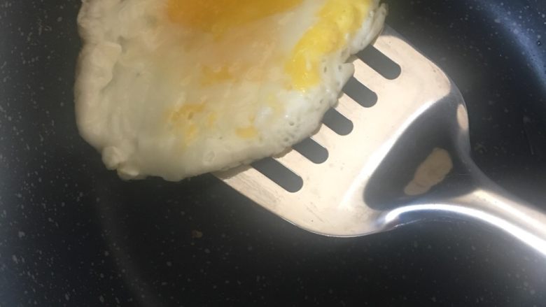 3. 3️⃣ 小火打入一个鸡蛋,煎至快凝固时撒上少量食盐,待成型,盛盘。