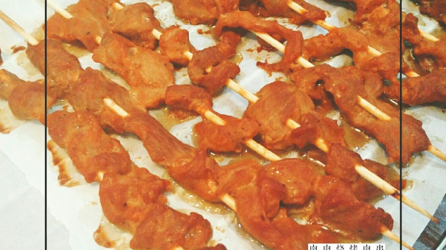 - 根据个人烤箱调节温度和时间。烤好的肉串根据口味,添加辣椒粉和孜然粉,腌制时间越久越入味哦