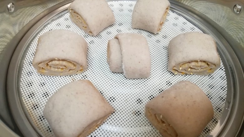 13. 蒸锅内放水,篦子上铺上硅胶垫,放上做好的花卷,二次发酵15分钟左右,凉水上锅,上汽后转中火蒸20分钟关火,焖5分钟左右。