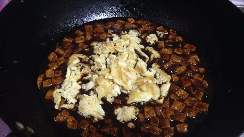 8. 热锅热油倒入蛋液炒成蛋碎盛出备用