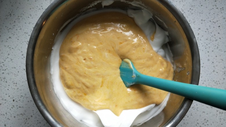 7. 先将打好的蛋白取三分之一放入蛋黄糊中翻拌均匀