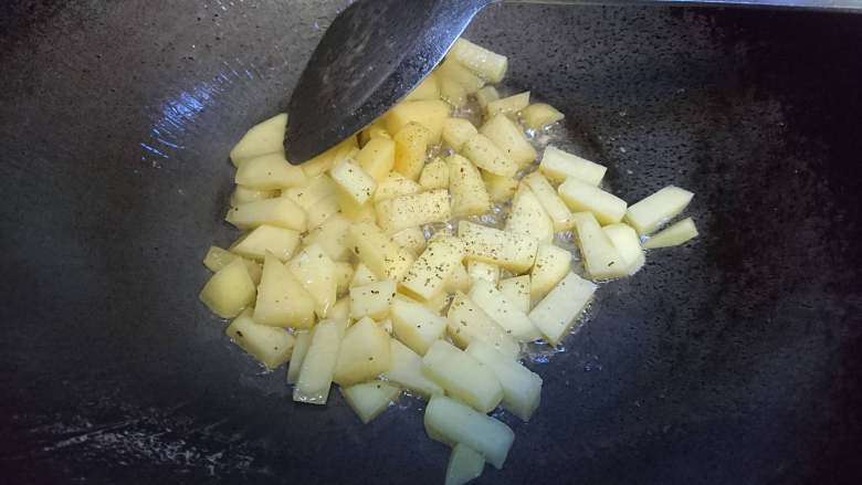 10. 翻炒土豆块,盐黑胡椒调味