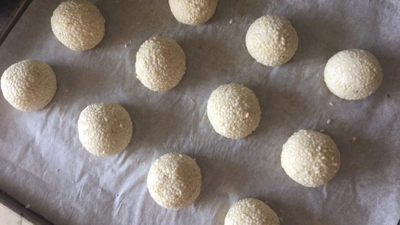 7. 取每个小面团沾少许水在芝麻里滚一圈,用手揉一下,适当稳固,芝麻不会落下来